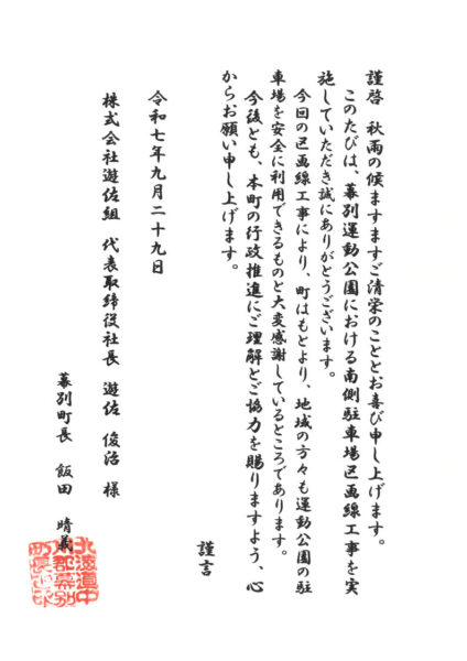 地域貢献活動(幕別町) 十勝総合振興局発注の「畑地帯糠内第3地区41工区」において、地域貢献として8月5日(火) に 幕別町運動公園の南側駐車場の区画線工事を実施し幕別町役場よりお礼状を頂きました。 幕別町役場よりお礼状授与 2025.09.29地域貢献新着情報